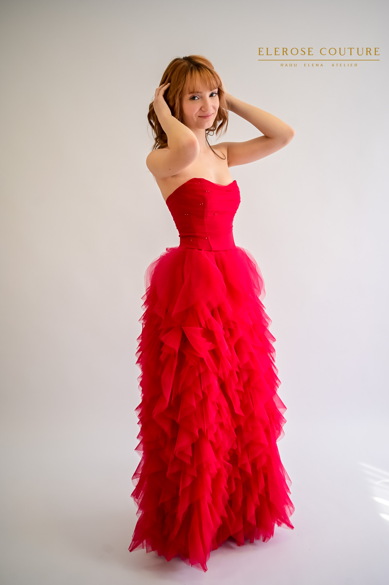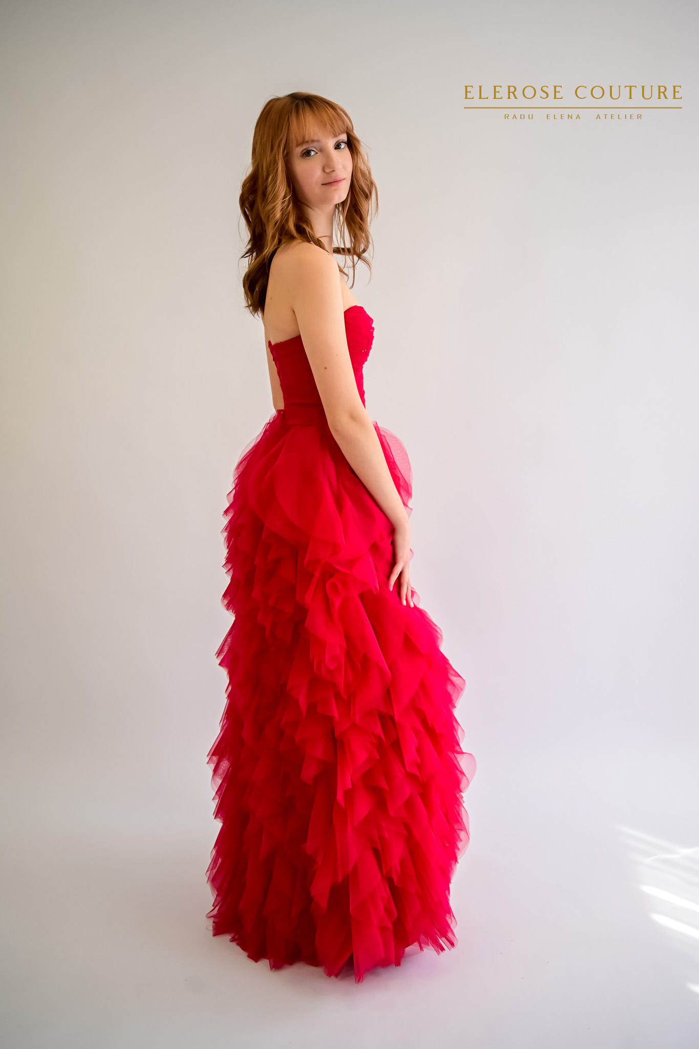 Este realizata din o bogatie de benzi de tulle foarte fin,care creeaza volum si miscare.Partea de sus este tip corset,mulat pe corp si reglabil.