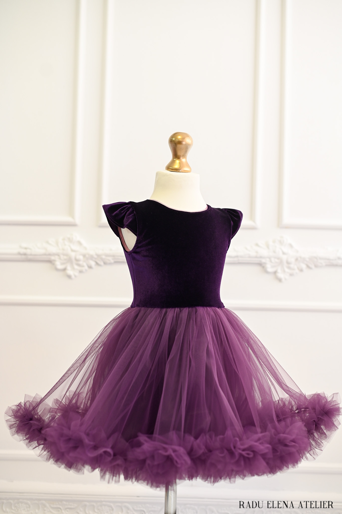O rochiță elegantă și copilăroasă în același timp. Bustul este realizat din catifea elastică și este dublat în interior cu o țesătură din bumbac. Fusta este realizată din căptușeală de mătase și tulle fin. Culoare:mov pruna.